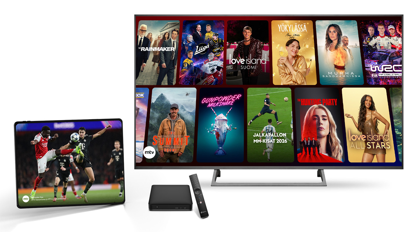 MTV:n koko urheilutarjonta (mm. Liiga, Mestarien liiga, MM-ralli, Super Formula ja jalkapallon MM-kisat) sekä kaikki sarjat ja leffat.